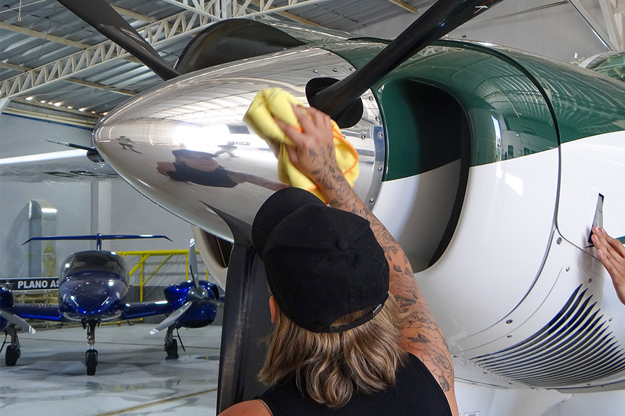 Não é apenas polir. É aplicar técnica de precisão para proteger a pintura, realçar o acabamento e garantir que cada voo comece com uma aeronave que reflete excelência.